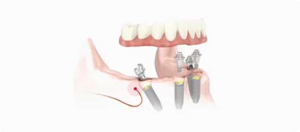 Импланты устанавливаются в области 5-го зуба под углом, что позволяет избежать дорогостоящей операции по наращиванию костной ткани.